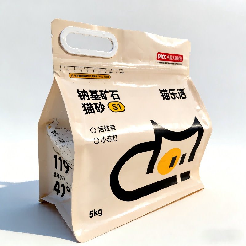 La estructura de sellado de ocho lados mantiene la bolsa estable y en posición vertical, ideal para exhibiciones destacadas en estantes. También facilita un apilamiento estable y un almacenamiento cómodo. El asa de la cremallera proporciona un sello seguro y confiable, evitando que entre humedad y polvo incluso al abrir y cerrar repetidamente. Además, el diseño del mango de plástico reforzado permite manipular fácilmente 5 kg de arena para gatos, mejorando la experiencia del usuario.